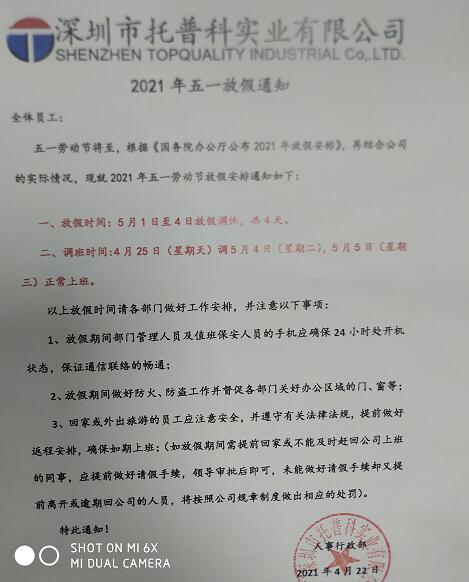現(xiàn)將深圳托普科實業(yè)五一放假通知公布如下: