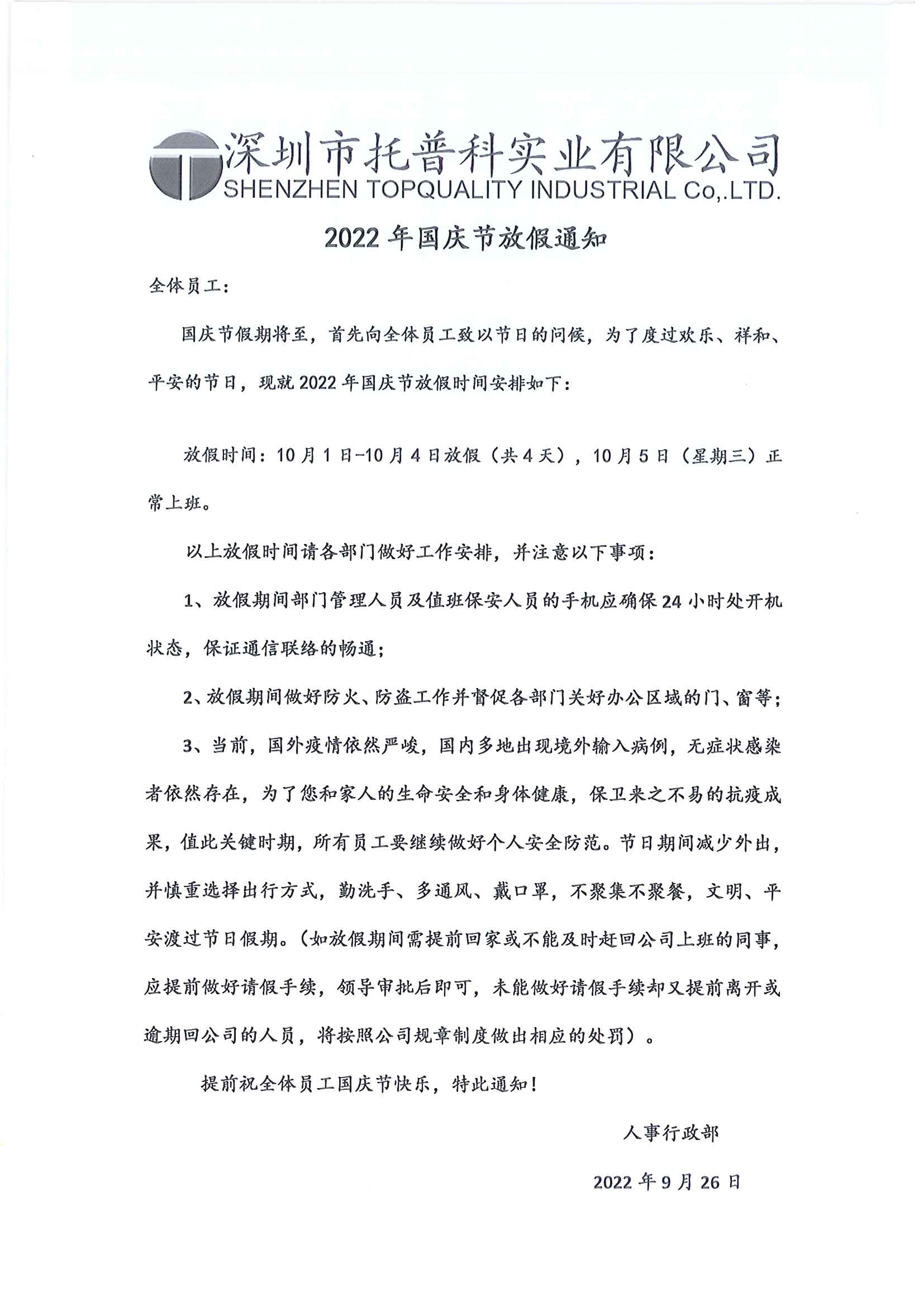 深圳托普科實(shí)業(yè)2022年國(guó)慶放假通知