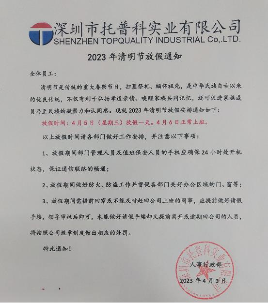 深圳托普科實(shí)業(yè)2023年清明節(jié)放假通知