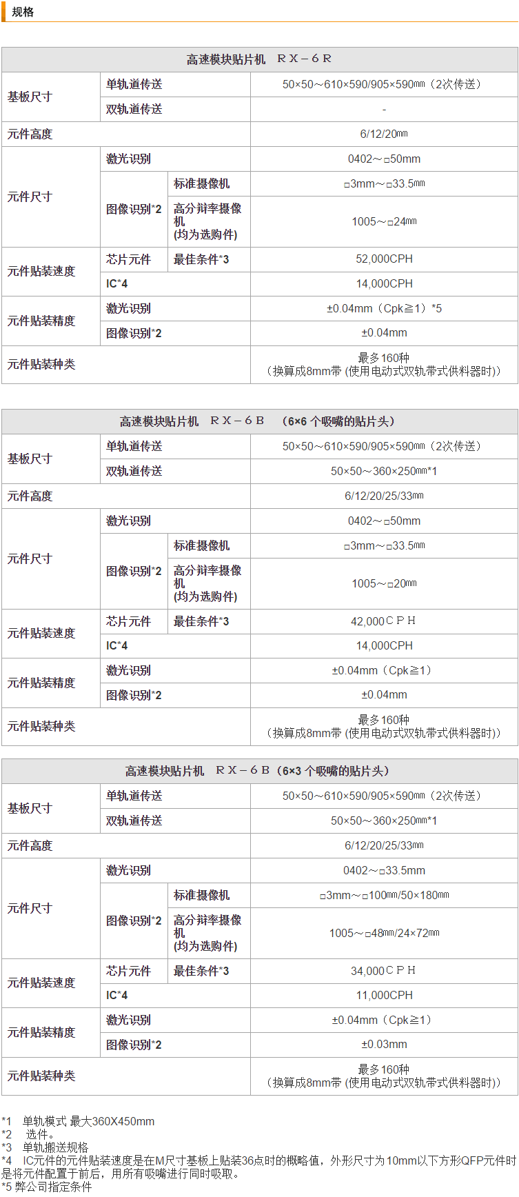 RX-6R是投入在RX-6系列中的新機(jī)型,由于改善了吸嘴上下移動的軸、增加了強(qiáng)度、優(yōu)化了貼裝頭的高度等,使貼裝速度與以往機(jī)相比大幅度地提高了24%,達(dá)到52,000CPH(最佳條件)。