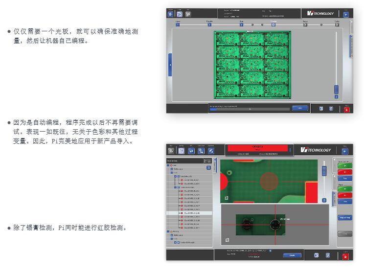 VI 3D錫膏檢測設(shè)備 PI Series 1. 自動編程可用于新產(chǎn)品的檢測 2. 除錫膏檢測外PIE也可進行固定膠檢測 3. 通過面積區(qū)域比率可實現(xiàn)自動分焊盤 4. 3D超大圖像檢查更便于使問題判斷 5. 通過SIGMA分析技術(shù),離線SPC,嵌入式 SPC 實現(xiàn)實時程序監(jiān)控